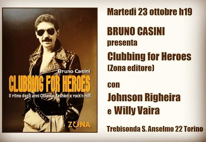 Domani, 23 ottobre alle 19  Bruno Casini presenta Clubbing for Heroes con Johnson Righeira e Willy Vaira.  Un “Rinascimento rock”, quello degli anni80, che non tocca solo Firenze (da qui hanno preso il largo Litfiba, Diaframma, Krypton, Magazzini Criminali e tanti altri), città dell’autore, ma investe tutta l’Italia. E infatti Bruno Casini (agitatore culturale, manager…