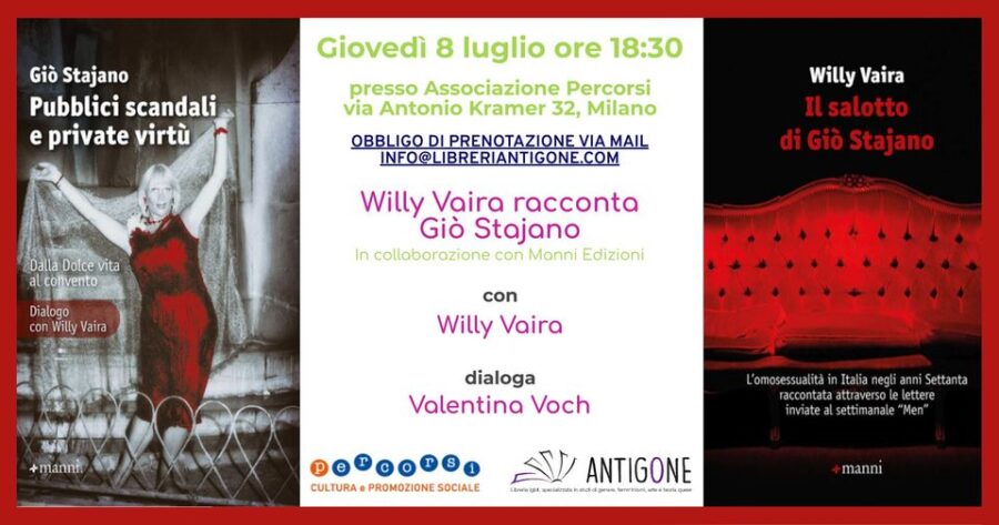 Mercoledì 9 giugno alle 18.30, Willy Vaira racconta l’incredibile vita di Giò Stajano a partire dai suoi libri “Il salotto di Giò Stajano”, in uscita a giugno, e “Pubblici scandali e private virtù. Dalla Dolce vita al convento” (Manni Editori) insieme a Rita Rogina, Walter Riccarelli e Antonio Mocciola. «Giò Stajano ha liberato stampandoli nero…